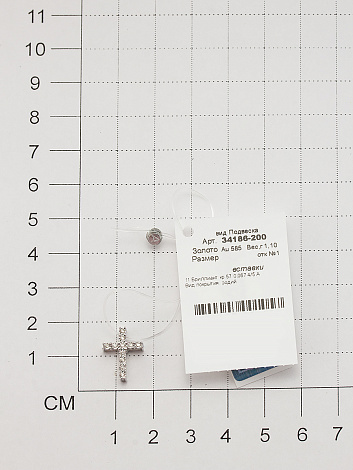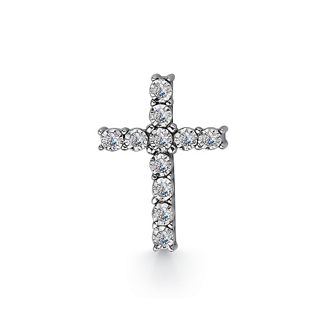 Стильная подвеска в виде декоративного крестика выполнена из белого золота 585 пробы и украшена в центре сверкающими бриллиантами