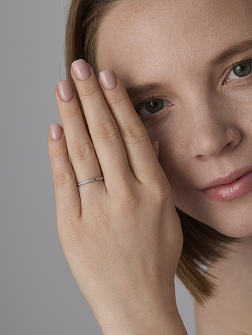 Нежное кольцо из белого золота 585 пробы, украшенное сияющей россыпью бриллиантов, — это воплощение элегантности и утонченности