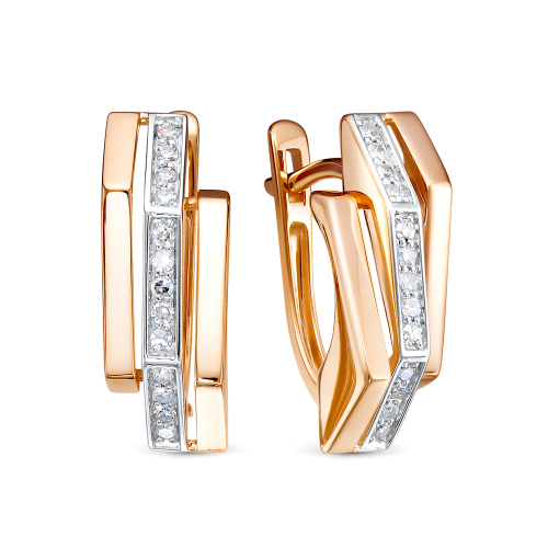 Серьги с бриллиантами выполнены из красного и белого золота 585 пробы. Благодаря сочетанию драгоценных металлов, серьги выглядят очень элегантно и стильно, а блеск бриллиантов просто приковывает взгляд.Тип замка - английский, самый надежный и удобный.