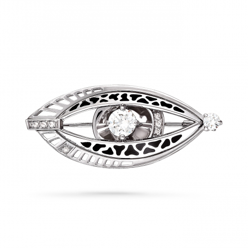 Серебряная брошь, выполненная в форме глаза, украшена сверкающими фианитами и черной эмалью, что придает ей глубокий и загадочный вид