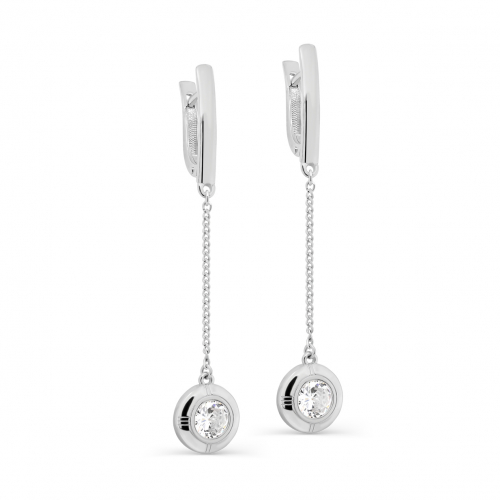 Длинные серьги выполнены из серебра 925 пробы с подвесными фианитами на цепочках