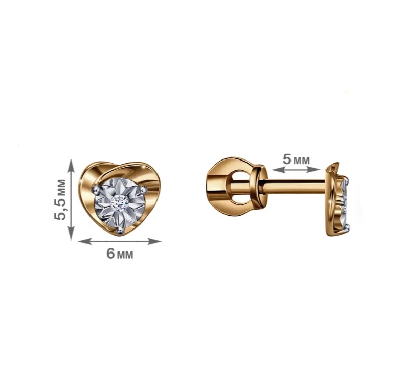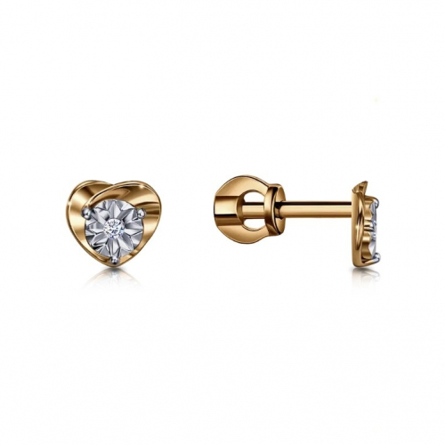 Элегантные серьги-пусеты выполнены в форме сердечек из красного золота 585 пробы и украшены сверкающими бриллиантами