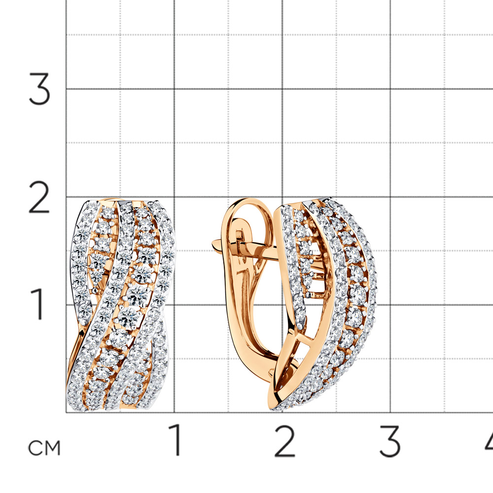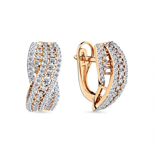 Серьги из красного золота, украшенные бриллиантами, они имеют элегантную форму с закругленными углами и инкрустированы множеством мелких бриллиантов, которые придают им блеск и изысканность. Серьги выполнены в классическом стиле, что делает их универсальными и подходящими для различных случаев.