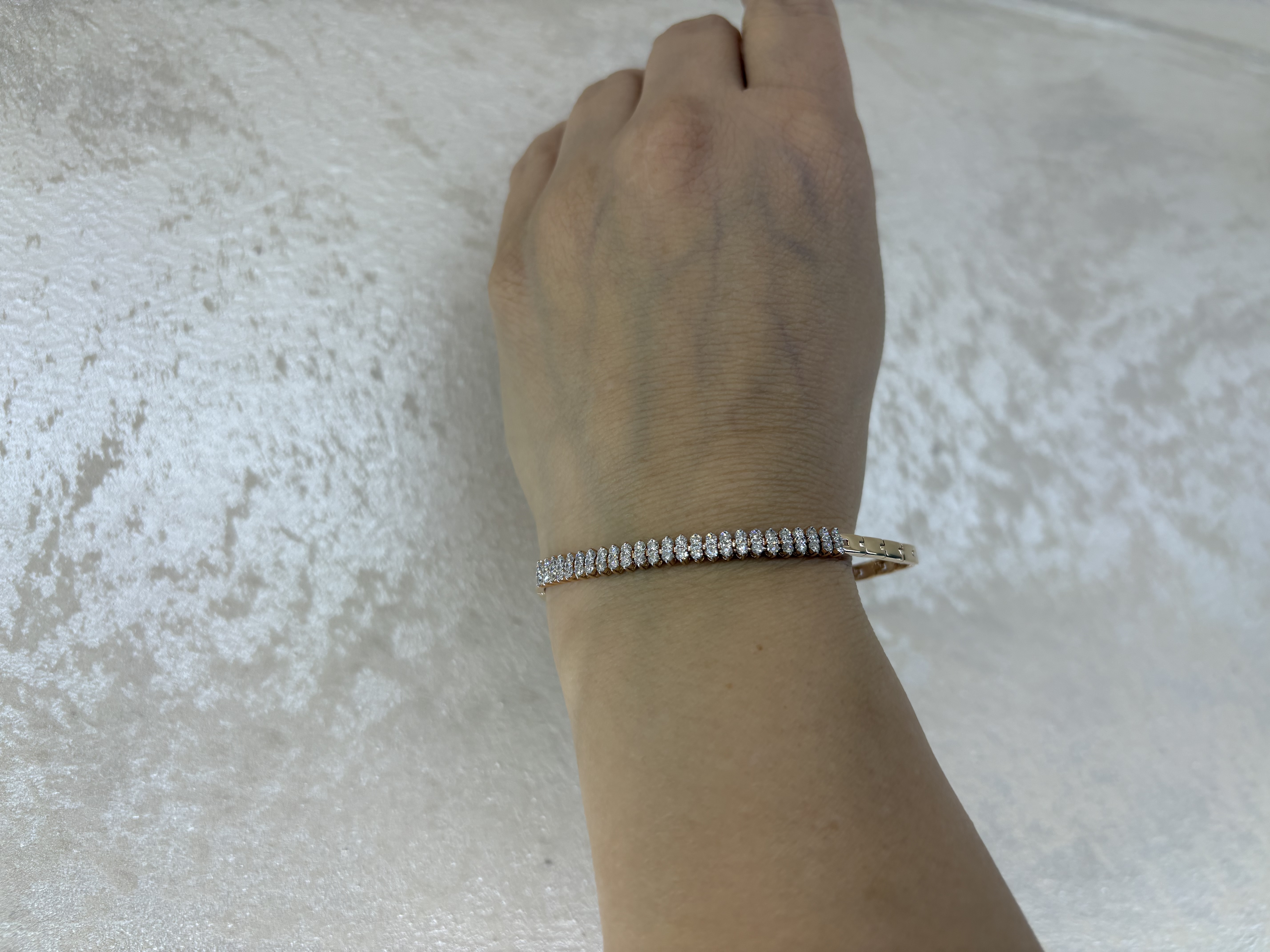 Особое внимание привлекает инкрустация из бриллиантов, расположенных в два ряда вдоль всей длины браслета,сверкающие камни добавляют изделию блеск и подчеркивают его утонченность. Браслет имеет классический замок, который обеспечивает удобство ношения и надежность фиксации.