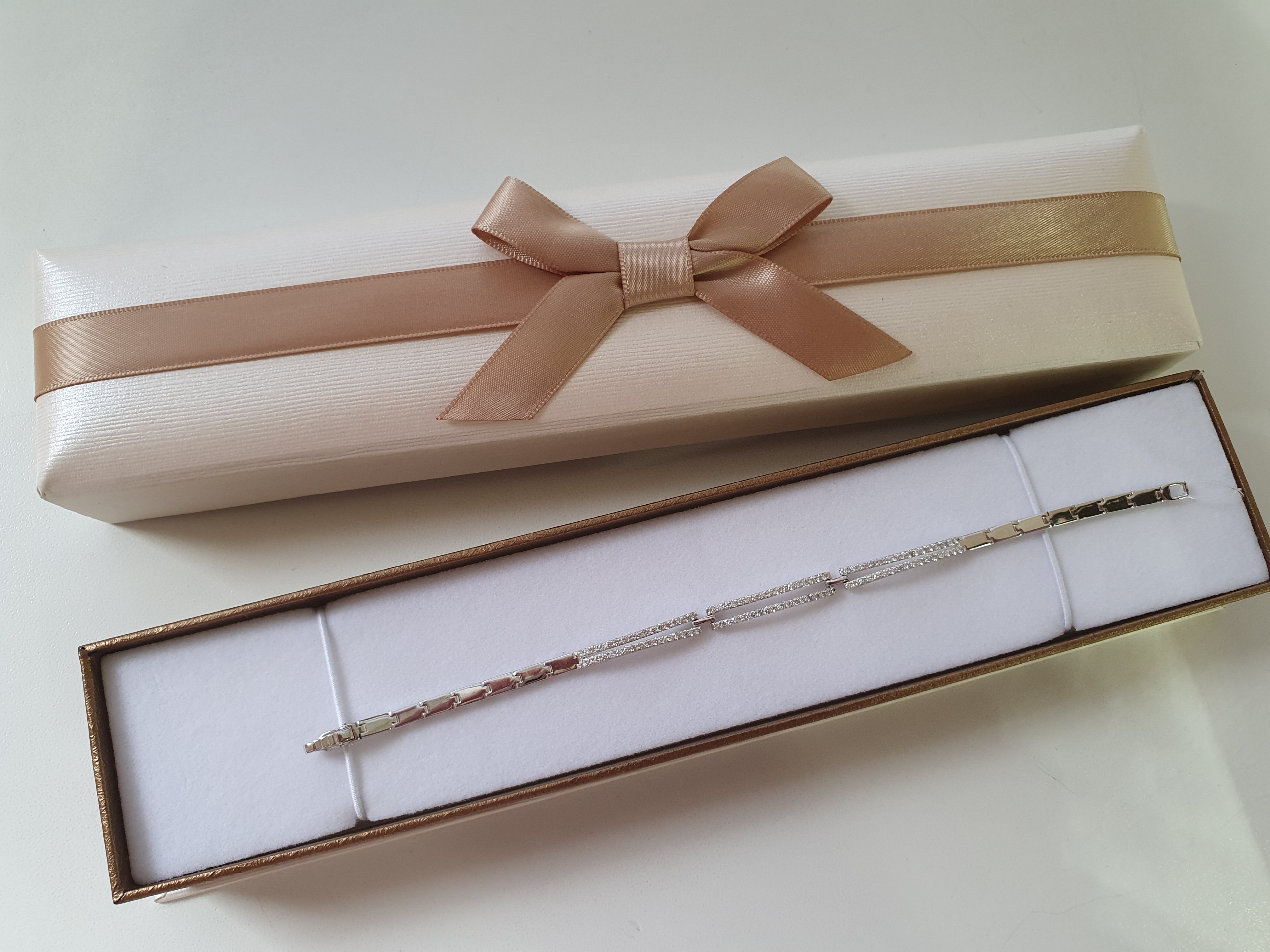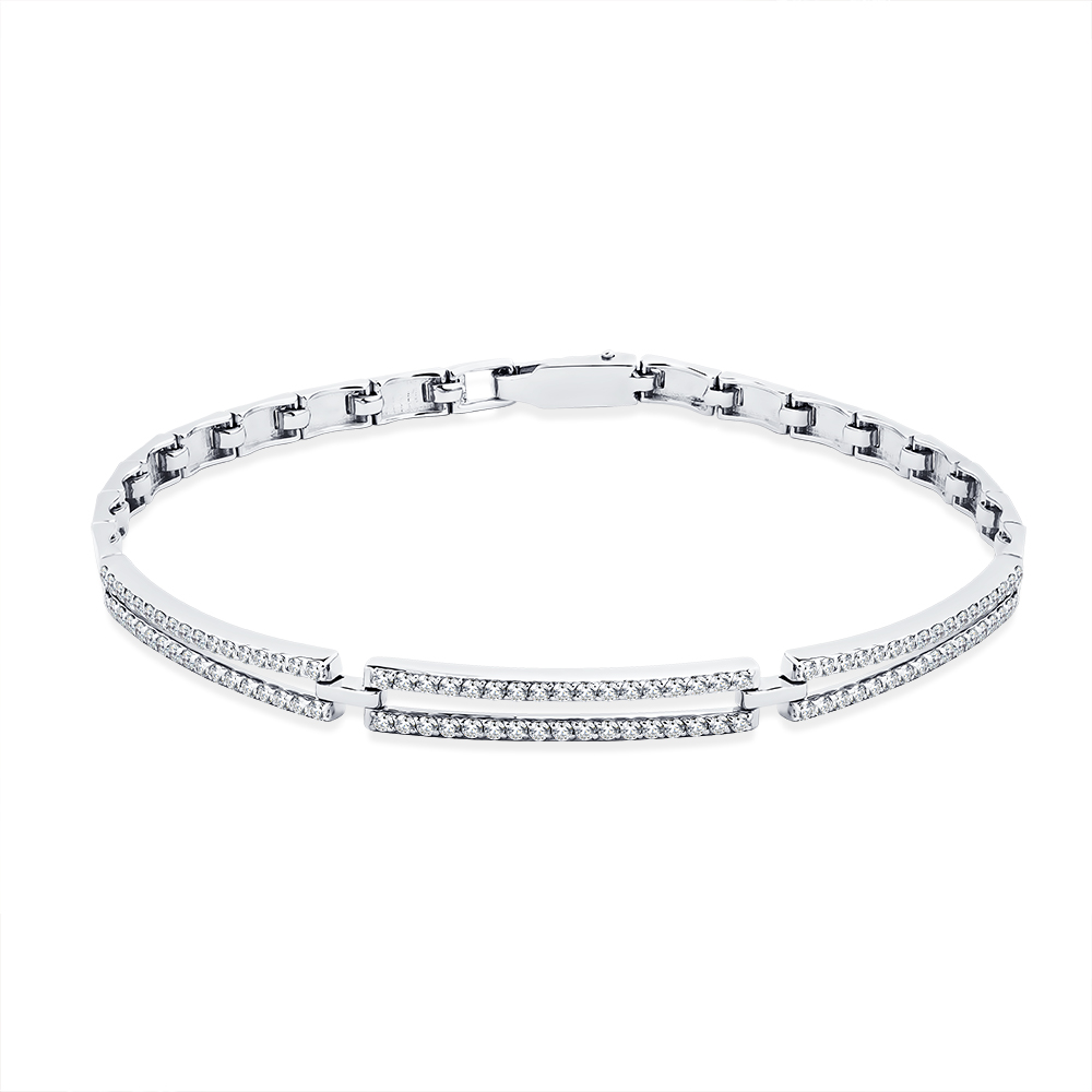 Представлен утонченный браслет с цепочкой, украшенный множеством мелких бриллиантов, которые создают эффект сверкающей дорожки