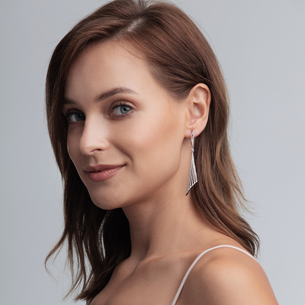 Представлены роскошные серьги, украшенные множеством мелких бриллиантов. Они имеют элегантную форму с каскадным дизайном, который придает им динамичность и объем. Серьги выполнены из белого золота , что подчеркивает их изысканность. Бриллианты, расположенные вдоль серег, создают эффект сверкающей дорожки, добавляя им блеска и подчеркивая их утонченность. Такие серьги могут стать прекрасным дополнением к вечернему наряду или повседневному образу, добавляя нотку элегантности и стиля.