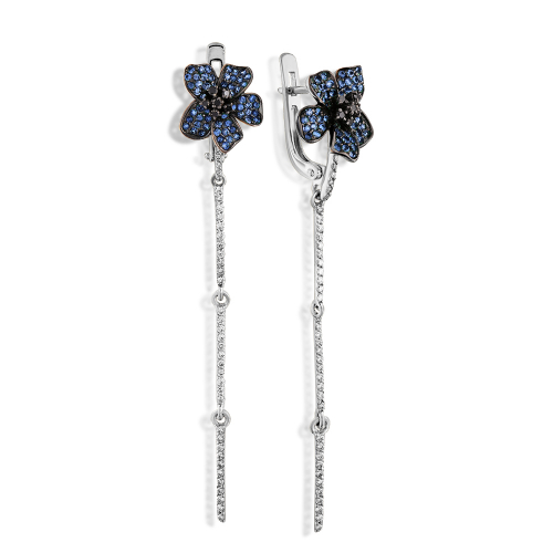Верхняя часть серег напоминает распускающиеся цветы, каждый из которых украшен мелкими сапфирами синего цвета, создающими эффект сияния.