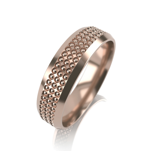 Стильное обручальное кольцо из красного золота 585 пробы. Украшено уникальной обработкой в виде ювелирной зерни в сочетании с идеально гладкой поверхностью кольца. Ювелирная зернь - это особый вид обработки золота, при котором поверхность смотрится очень оригинально, она искрится и играет и имитирует камни, отличается такой вид обработки особой практичностью и блеском.
