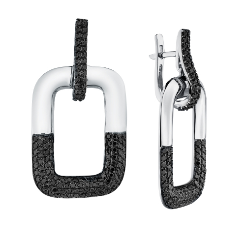 Серьги представляют собой изысканное сочетание черного и белого, создавая контраст, который притягивает взгляд и подчеркивает их элегантность. Центральное место занимают сверкающие черные бриллианты, идеально ограненные и заключенные в филигранные оправы, которые подчеркивают их чистоту и игру света.