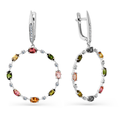 Серьги выполненны из белого золота 585 пробы, в виде круга обрамленного различными оттенками турмалина и бриллиантами. Серьги имеют элегантный дизайн с чередующимися вставками, что придает им изысканный и роскошный вид.