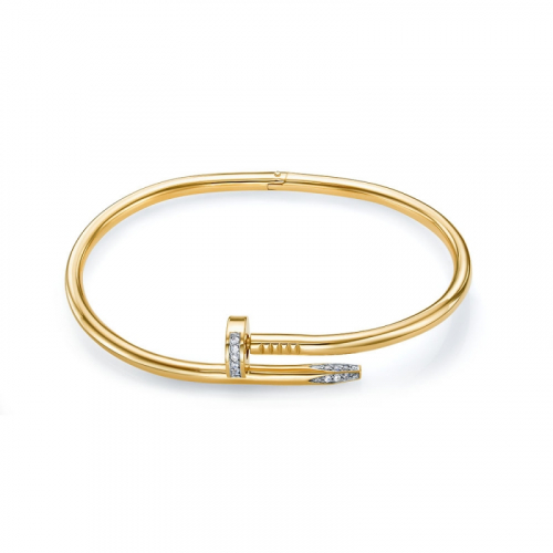 Стильный жёсткий браслет в виде гвоздя, украшенного фианитами, выполнен из красного золота 585 пробы