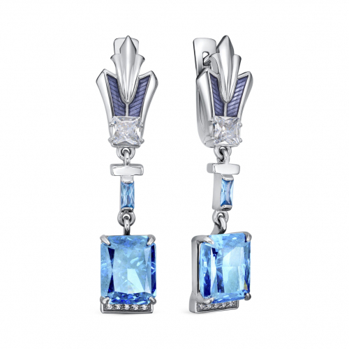 Стильные серебряные серьги выполнены из качественного серебра 925 пробы и украшены стеклянными вставками в виде голубого бриллианита, окруженными сверкающими фианитами