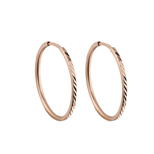 Серьги "конго", выполненные в форме колец, с алмазной гранью, в красном золоте 585 пробы. Диаметр серег 3см. Алмазная грань- это особый вид обработки золота, при котором поверхность смотрится очень ярко, она искрится и играет и имитирует камни, отличается такой вид обработки особой практичностью и блеском.