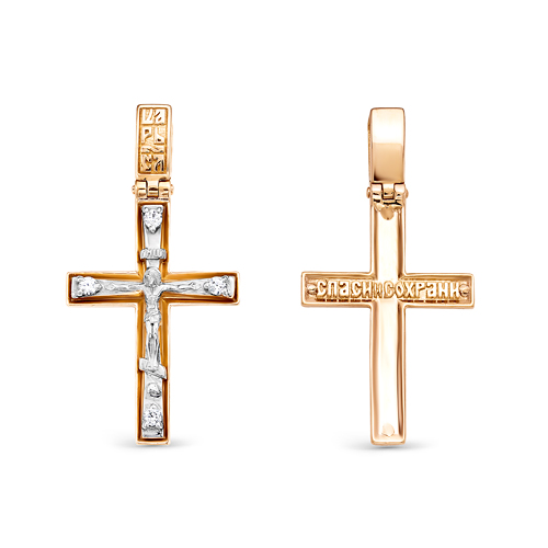 Православный крестик выполнен из красного и белого золота 585 пробы и украшен сверкающими бриллиантами