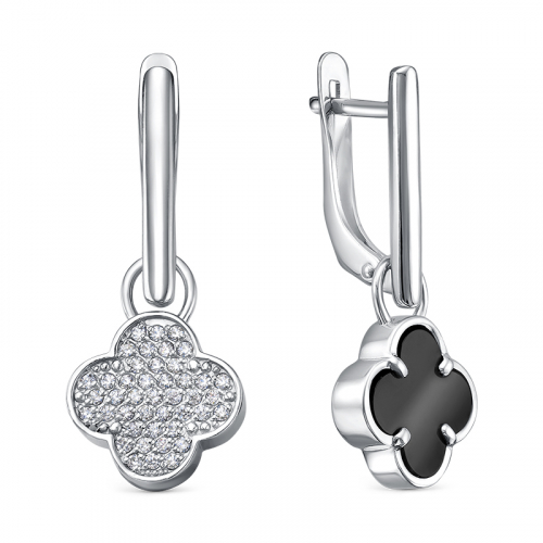 Оригинальные серебряные серьги выполнены из 925 пробы и имеют необычную подвесную часть, которая переворачивается, открывая разные вставки