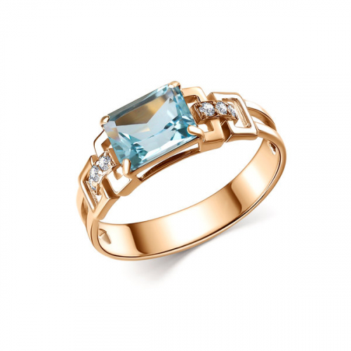 Стильное кольцо выполнено из красного золота 585 пробы, украшено голубым топазом формы багет и фианитами