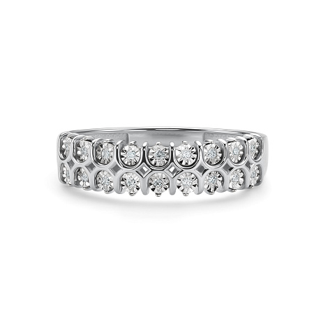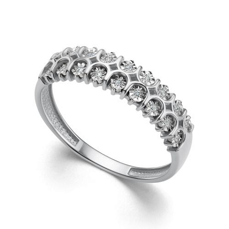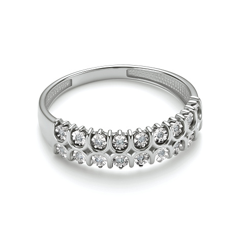 Стильное кольцо, украшенное дорожками сверкающих бриллиантов, выполнено из белого золота 585 пробы