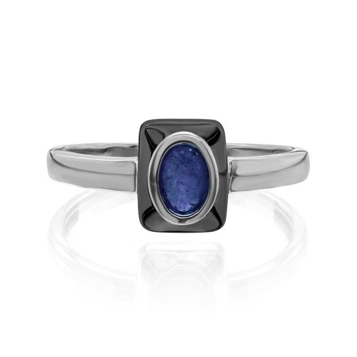 Кольцо с синим сапфиром выполнено из родированного серебра 925 пробы