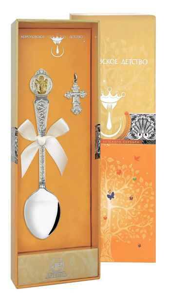 Крестильный набор из серебряной ложечки и подвески в виде декоративного крестика из серебра 925 пробы