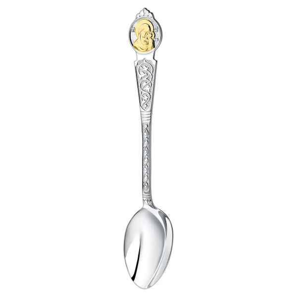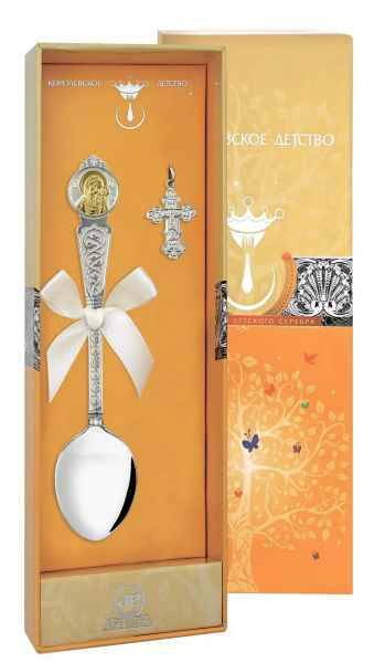 Крестильный набор из коллекции "Королевское детство" состоит из серебрянной ложки с позолотой и подвески в виде крестика из серебра 925 пробы. Ложку украшает позолоченное изображение иконы "Казанская Божья Матерь". Набор вместе со свидетельством об освящении упакован в праздничный футляр. Все вместе станет прекрасным подарком и для мальчика, и для девочки.