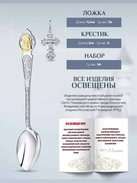 Крестильный набор из коллекции "Королевское детство" состоит из серебрянной ложки с позолотой и подвески в виде крестика из серебра 925 пробы