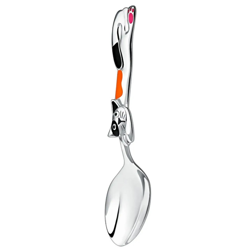 Серебряная детская ложка с ручкой в виде милого котика, покрытая яркой эмалью, станет любимым аксессуаром для кормления малыша