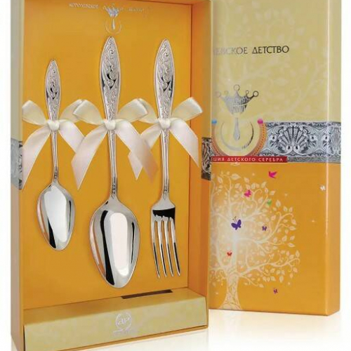 Десертный набор, состоящий из ложки, вилки и чайной ложки, из коллекции "Морозко" выполнен в серебре 925 пробы без примесей посторонних металлов и без применения гальванического покрытия Зеркальная поверхность изделия отполирована вручную. Столовое серебро из этой коллекции отличается эргономичностью и эстетическим дизайном, который подчеркнет индивидуальность Вашего дома. В стоимость набора входит фирменный стильный футляр. В комплект поставки входит: