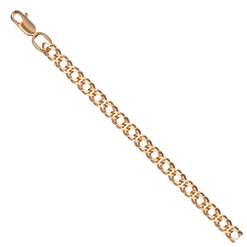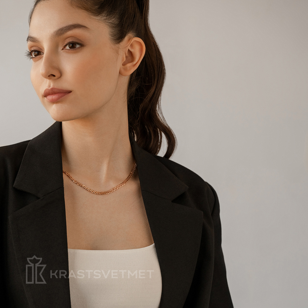 Полновесная цепь из красного золота 585 пробы выполнена стильным плетением «двойной ромб», с изящной алмазной гранью