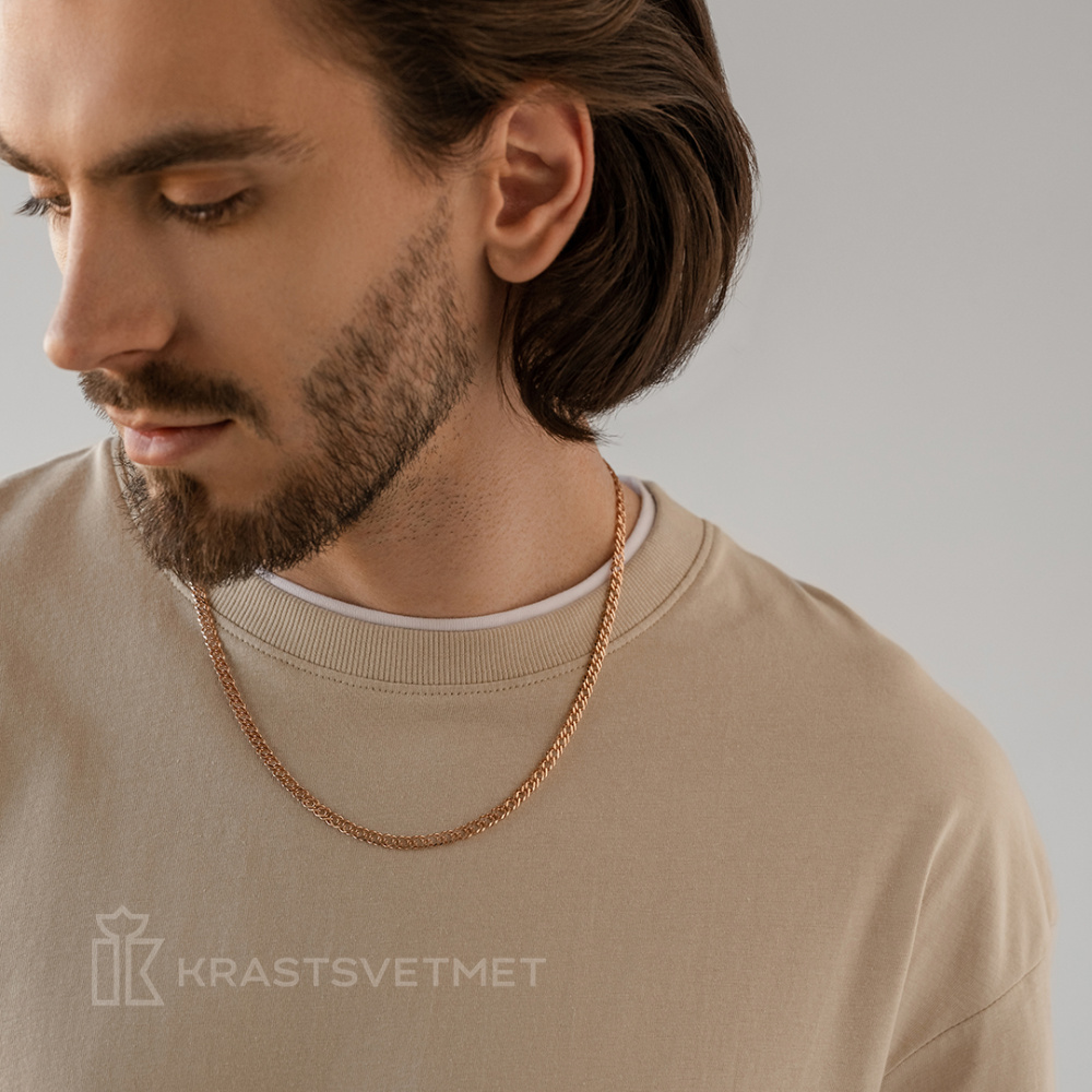 Полновесная цепь из красного золота 585 пробы выполнена стильным плетением «двойной ромб», с изящной алмазной гранью. Сложная конструкция плетения и богатая текстура делают её невероятно выразительной и привлекательной, подчёркивая красоту золотого сплава. Безупречно сидит как на шее сильного пола, так и на хрупких женских плечах, привлекая внимание своей утонченностью. Диаметр проволки 0,70 мм. Представлено брендом КРАСЦВЕТМЕТ. В комплект поставки входит: