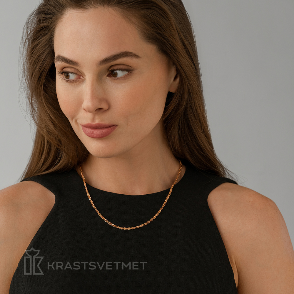Цепь из красного золота 585 пробы с элегантным плетением «Сингапур» и сияющей отделкой алмазной гранью. Знаменитое кручёное плетение «Сингапур» приятно удивляет не только своей красотой, но и высокими эксплуатационными качествами. Игривые волны цепочки играют солнечными лучами, создавая яркие переливы и привлекая внимание окружающих. Помимо эстетической ценности, такая цепь отличается повышенной прочностью и долговечностью, что позволяет пользоваться ею долгие годы, не опасаясь износа. Этот аксессуар идеально подойдёт как для повседневного ношения, так и для торжественных мероприятий, добавляя изюминку и элегантность вашему образу. Диаметр проволки 0,50мм. Представлено брендом КРАСЦВЕТМЕТ.