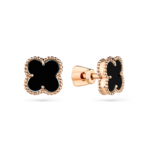 Серьги - пусеты выполнены из красного золота 585 пробы, украшены агатами в форме цветка. Черный цвет камней подчеркивает благородность металла и привлекает внимание окружающих. Тип замка - пусет,надежный и удобный.