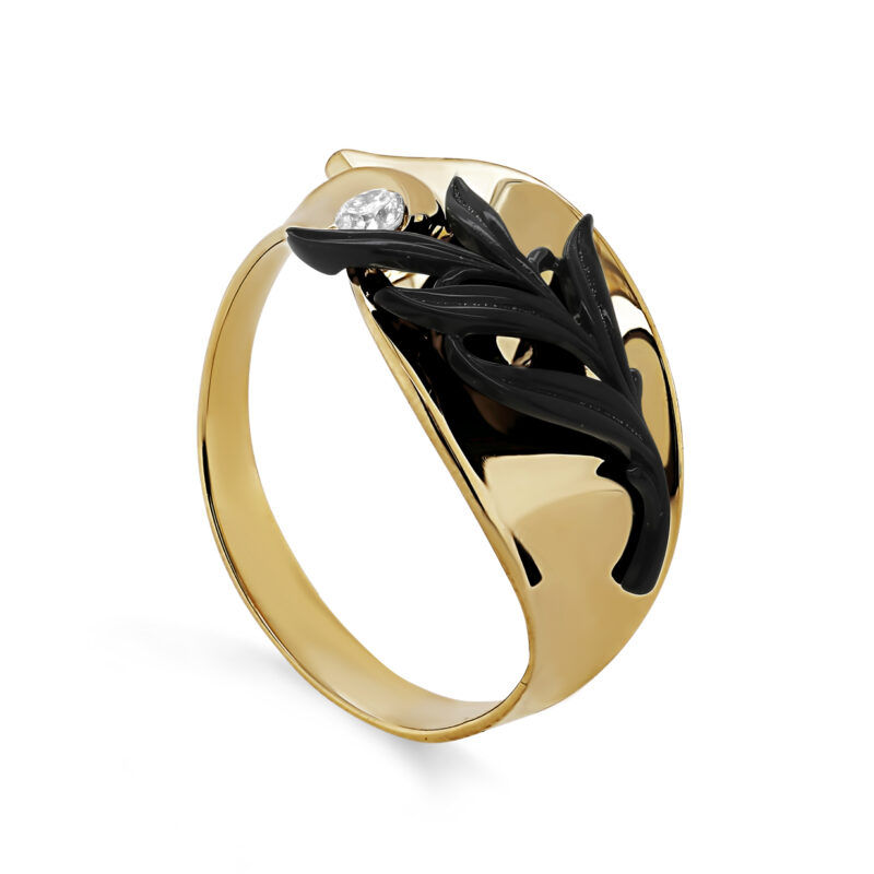 Это кольцо — воплощение роскошной элегантности, где теплый оттенок лимонного золота гармонично сочетается с изысканным черным узором, напоминающим ветви или листья