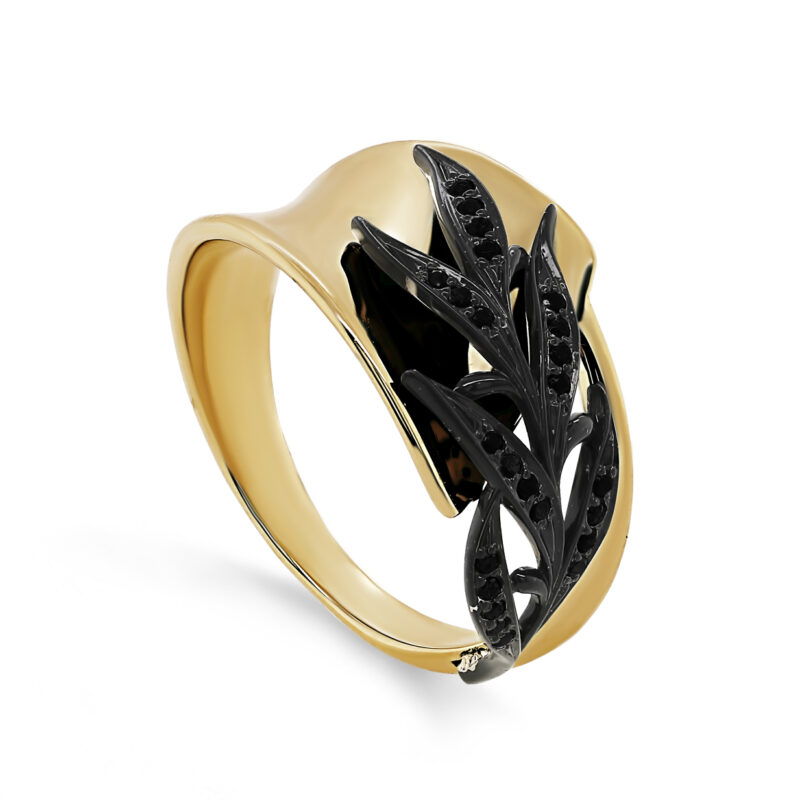 Стильное кольцо из лимонного золота с изысканным элементом в форме пера, инкрустированного черными бриллиантами
