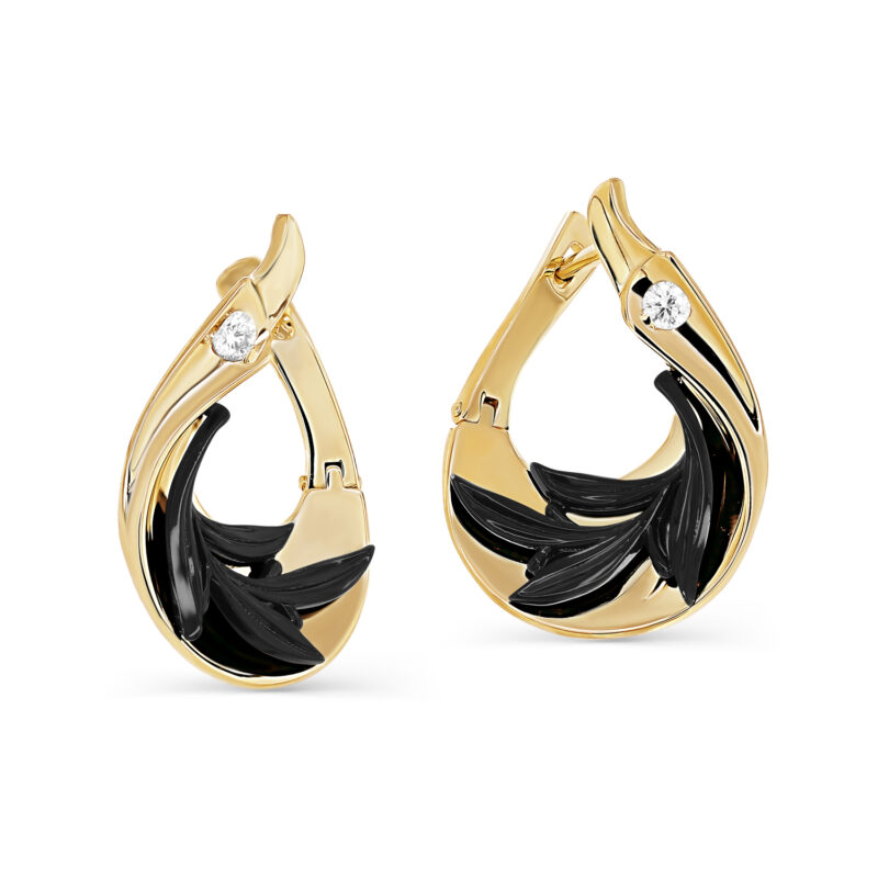 Эти серьги — воплощение роскошной элегантности, где теплый оттенок лимонного золота гармонично сочетается с изысканным черным узором, напоминающим ветви или листья