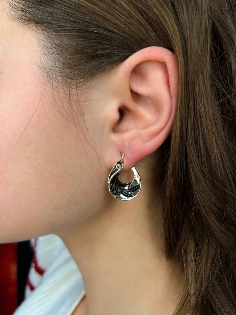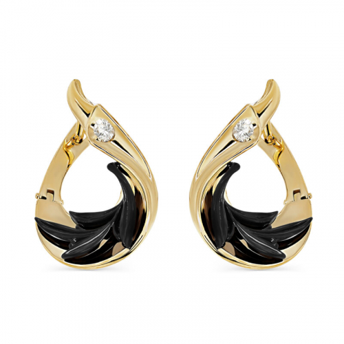 Эти серьги — воплощение роскошной элегантности, где теплый оттенок лимонного золота гармонично сочетается с изысканным черным узором, напоминающим ветви или листья. В центре композиции сверкает ослепительный бриллиант, словно капля росы на темной ветке, добавляя игривый блеск и глубину дизайну. Каждая линия серег продумана до мелочей, создавая ощущение движения и природной грации, что делает их идеальным выбором для тех, кто ценит уникальность и изысканность. Носите их как символ вашей индивидуальности — это не просто украшение, а произведение искусства, которое подчеркнет ваш стиль.