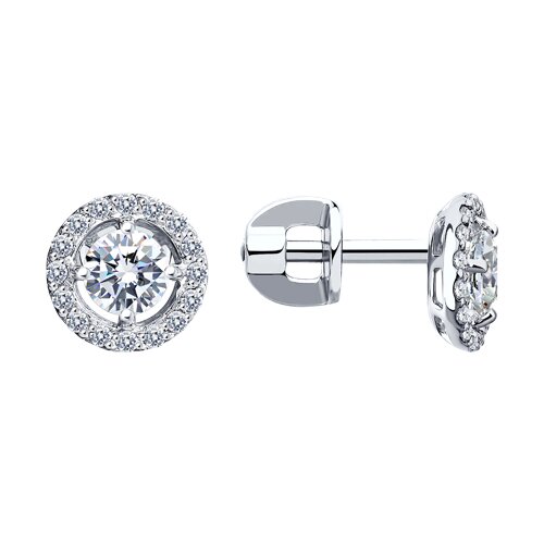 Серьги - пусеты круглой формы с фианитом в центре, в окружении меньших по размеру фианитов, выполнены из белого золота 585 пробы. Драгоценный металл красиво блестит как в искусственном, так и в естественном свете, а вставка играет собственными гранями, дополняя визуальный эффект. Тип замка - пусет, самый надежный и комфортный. Изделие представлено брендом SOKOLOV. Вставки: 32 × Фианит недраг Бесцветный 1.00 ~0,272 кар