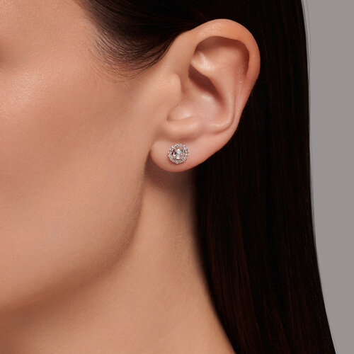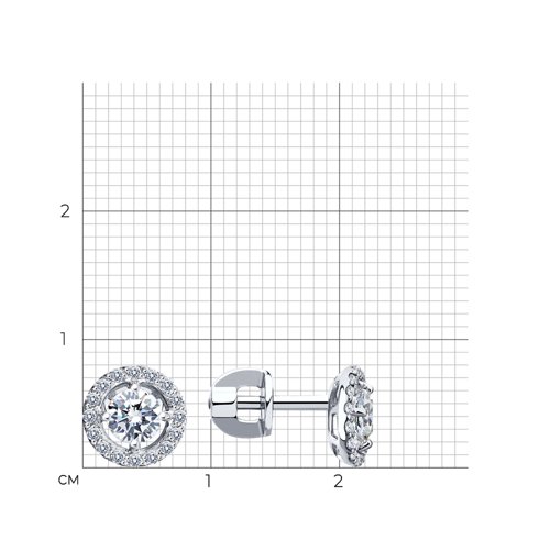 Серьги - пусеты круглой формы с фианитом в центре, в окружении меньших по размеру фианитов, выполнены из белого золота 585 пробы