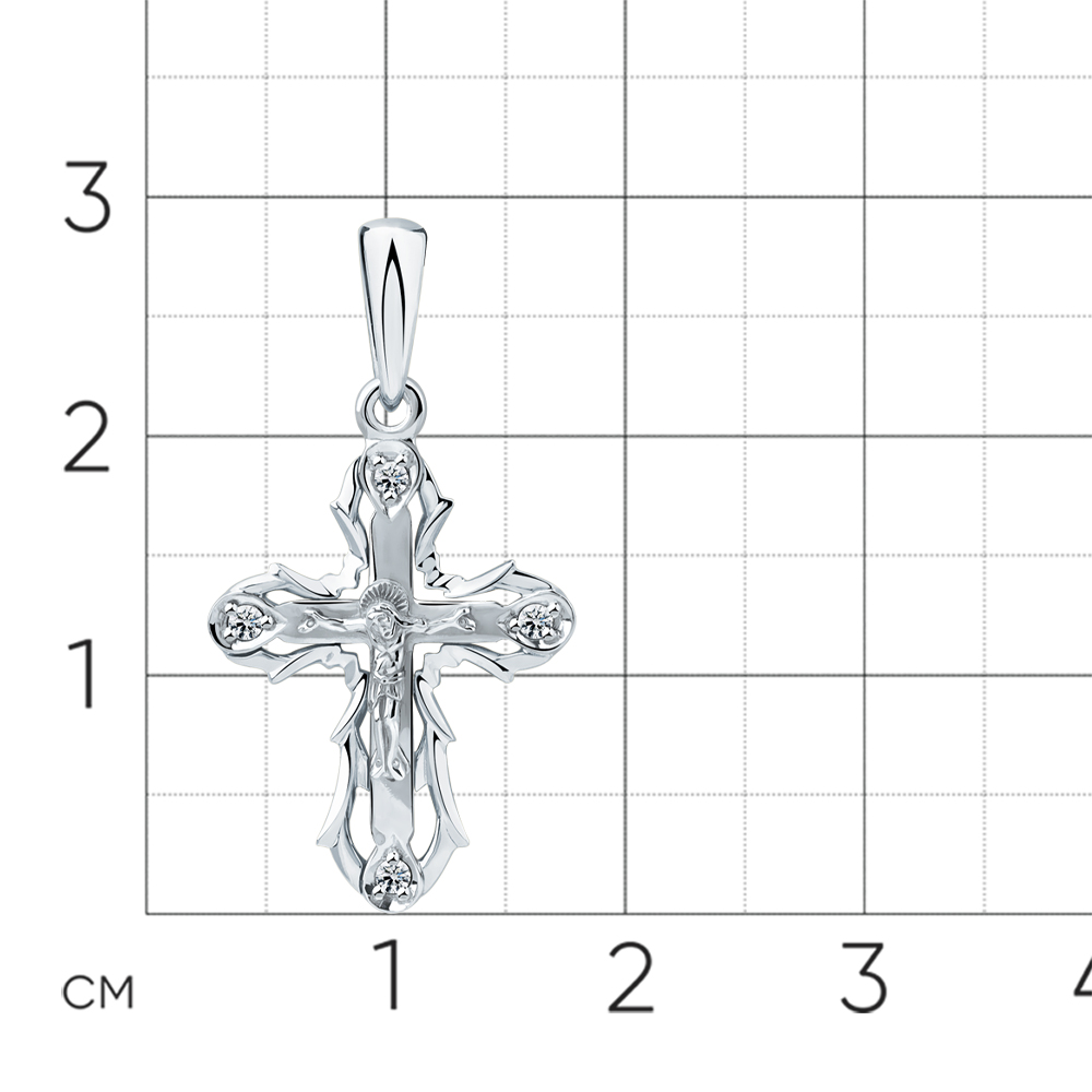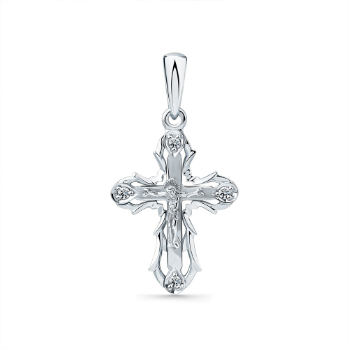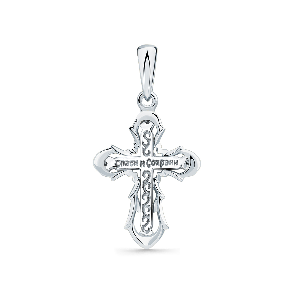 Этот православный крест из белого золота — символ глубокой веры и благочестия, украшенный сверкающими бриллиантами, которые подчеркивают его благородные очертания и центральный образ Распятия Христова