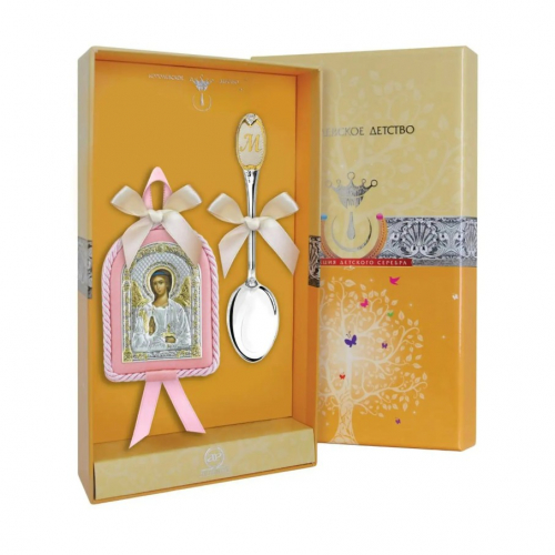 Детский набор включает в себя элегантную серебряную ложку и миниатюрную икону