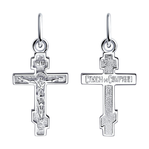 Подвеска в виде нательного креста прямой формы выполнена из серебра 925 пробы. Крест соответствует всем канонам Православной церкви, на внешней стороне - распятие, на обороте надпись "Спаси и сохрани". Украшение покрыто металлом платиновой группы - родием, он защищает серебро от потемнения и придает искрящийся яркий блеск. Изделие представлено брендом "SOKOLOV". В комплект поставки входит:
