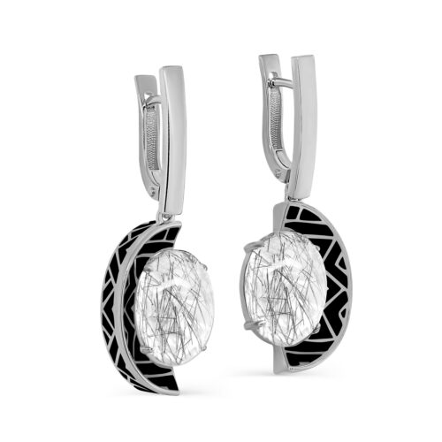 Стильные удлинённые серьги с кварцем и чёрной ювелирной эмалью, выполнены из серебра 925 пробы