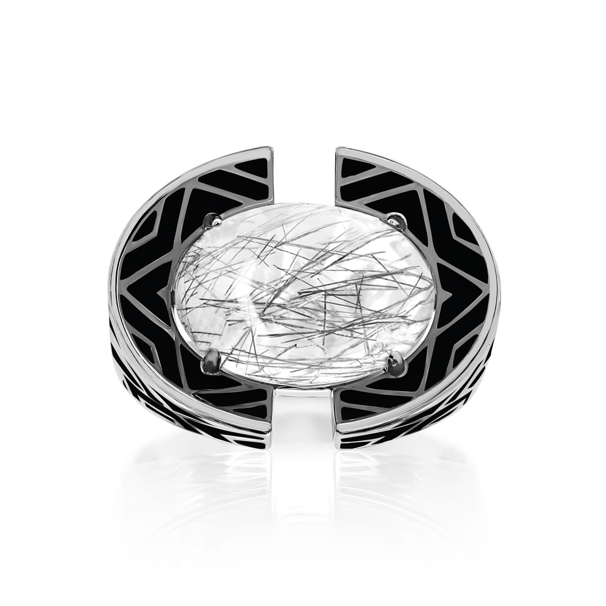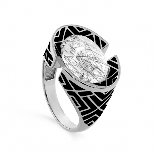 Объёмное кольцо с кварцем и чёрной ювелирной эмалью, выполнено из серебра 925 пробы