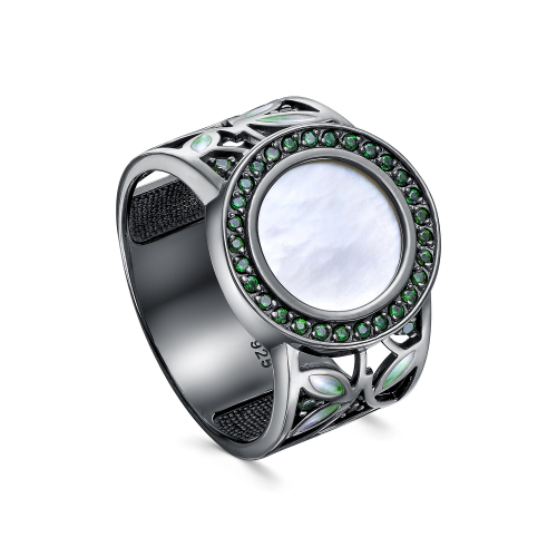 Сказочное кольцо из серебра 925 пробы украшено изысканным перламутром и зеленоватыми фианитами, даря ощущение тепла и комфорта