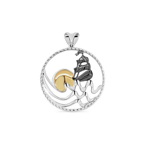 Изящная подвеска круглой формы с силуэтом кораблика на волнах, выполнена из родированного серебра 925 пробы, с частичным золочением