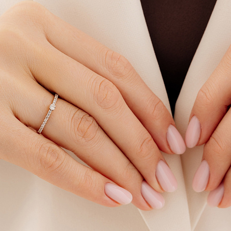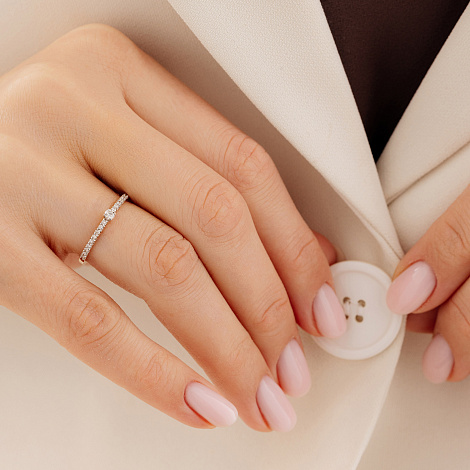 Изящное кольцо с бриллиантом в центре, красоту которого подчёркивает дорожка меньших по размеру бриллиантов, выполнено из красного золота 585 пробы. Такое украшение идеально впишется в повседневный образ, подчеркнув вашу красоту и элегантность.