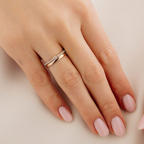 Изящное кольцо с бриллиантом в центре, красоту которого подчёркивает дорожка меньших по размеру бриллиантов, выполнено из красного золота 585 пробы