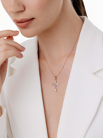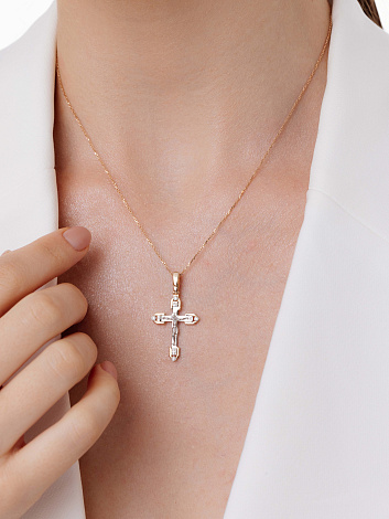Подвеска в виде нательного креста прямой формы выполнена из комбинированного золота 585 пробы, украшенная сияющими бриллиантами