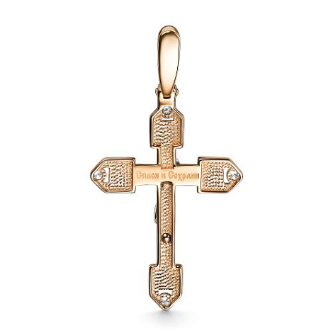 Подвеска в виде нательного креста прямой формы выполнена из комбинированного золота 585 пробы, украшенная сияющими бриллиантами. Крест соответствует всем канонам Православной церкви, на внешней стороне - распятие, на обороте надпись "Спаси и сохрани". Изделие представлено брендом "Алькор". Средняя характеристика камней на артикул: 4 Бриллиант Круг 57 0.04 4/5. В комплект поставки входит: