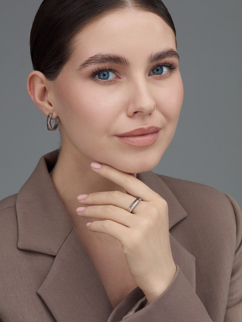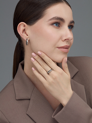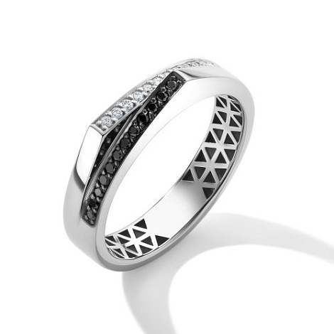 Нежное кольцо, украшенное чёрными и бесцветными сверкающими бриллиантами, выполнено из белого золота 585 пробы