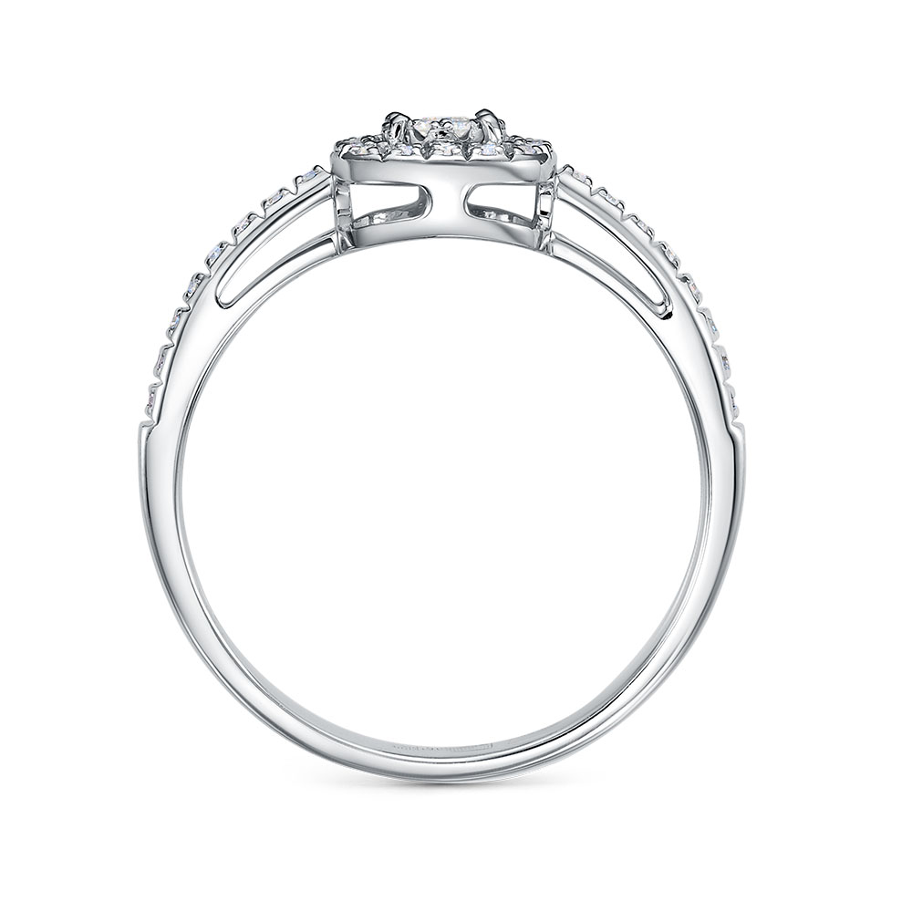 Роскошное кольцо из белого золота с бриллиантами. Центральный камень в оправе «квадрат в квадрате» окружён паве-бриллиантами, а изящные плечи, усыпанные камнями, плавно переходят в полированный ободок.